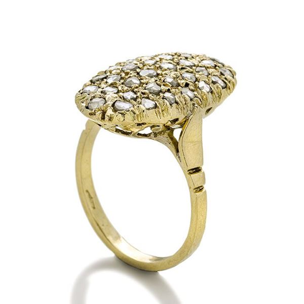 MATERIALE: oro giallo e diamanti DESCRIZIONE: anello a losanga interamente impreziosito con rose di diamante, reca il marchio 750 MISURE: anello 16 PESO: gr 5.7