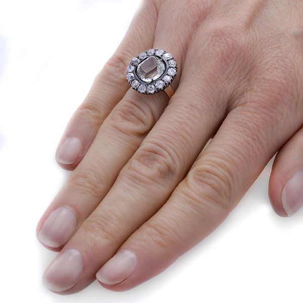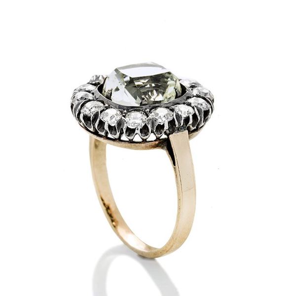 MATERIALE: oro a basso titolo, argento, acquamarina e diamanti DESCRIZIONE: anello a margherita realizzato con acquamarina taglio ovale incorniciata da diamanti taglio vecchio, reca inciso il punzone dell'oro russo 1908.1917 MISURE: anello 13 PESO: gr 4.7