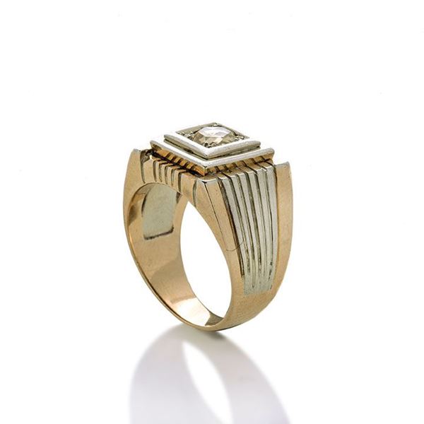 MATERIALE: oro giallo, oro bianco e diamante DESCRIZIONE: anello a scudo realizzato con diamante taglio rosa coronè su base quadrata con grandi baccellature laterali in oro bianco MISURE: anello 13.5 PESO: gr 8.8