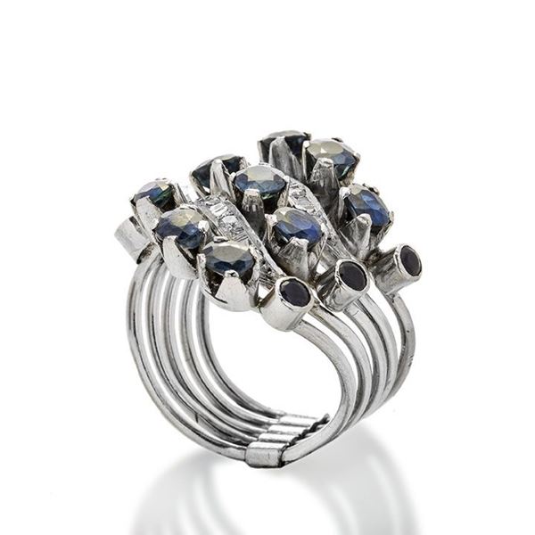 MATERIALE: oro 14 kt, diamanti e zaffiri DESCRIZIONE: anello di ispirazione geometrica realizzato con cinque anelli a fascia più piccoli, mobili, impreziositi con diamanti taglio brillante e zaffiri di vari tagli, reca il marchio 14 MISURE: anello 10.5 PESO: gr 9.5