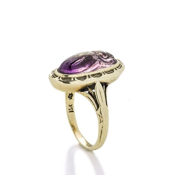 MATERIALE: oro a basso titolo e ametista incisa DESCRIZIONE: anello realizzato con ametista incisa come uno scarabeo, su base sagomata e decorata con foglie stilizzate, reca il marchio 15k MISURE: anello 6 PESO: gr 3.6
