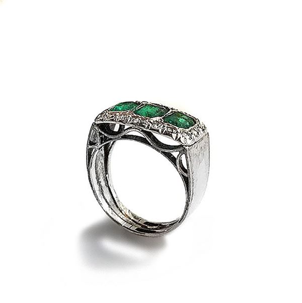 MATERIALE: oro bianco, diamanti e smeraldi DESCRIZIONE: anello a ponte realizzato con tre smeraldi taglio rettangolare incorniciati da diamanti taglio huit huit MISURE: anello 9.5 PESO: gr 4.3