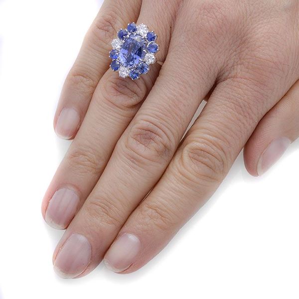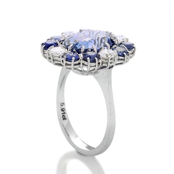 MATERIALE: oro bianco, diamanti e zaffiro naturale DESCRIZIONE: anello a margherita realizzato con zaffiro naturale taglio cuscino incorniciato da quattro diamanti taglio brillante alternati a zaffiri, reca il marchio 750 e ct 5.91 MISURE: anello 14 PESO: zaffiro ct. 5.91, corredato di certificato Gemmological Certification Services n. 79229-41 in data 14.08.2019, gr 6.5