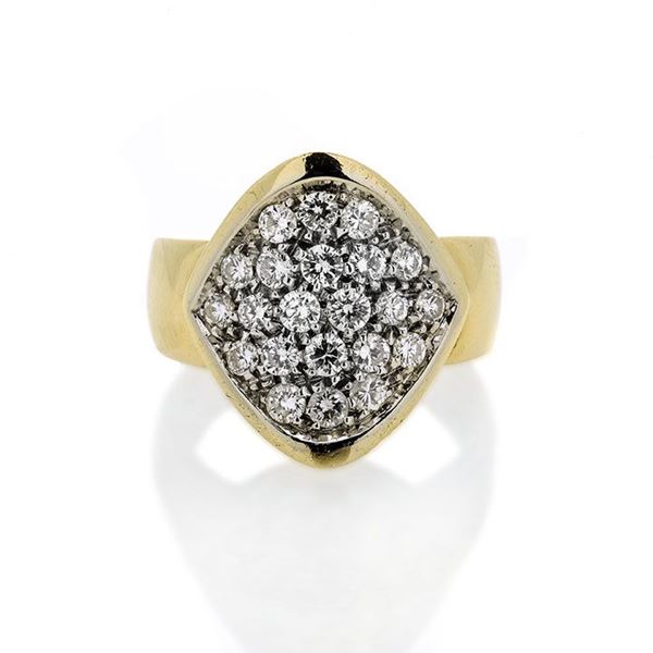 MATERIALE: oro giallo e diamanti DESCRIZIONE: anello a scudo di ispirazione geometrica, impreziosito con pavè di diamanti, reca il marchio 750 MISURE: anello 9.5 PESO: gr 7.2