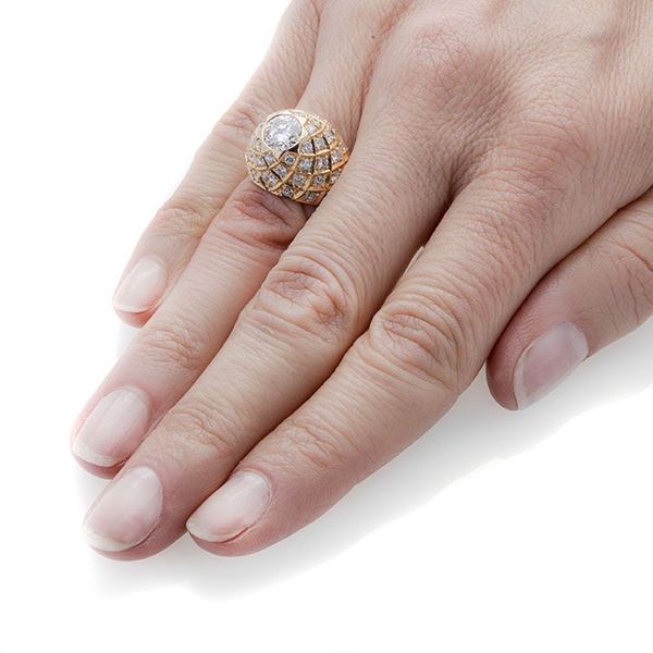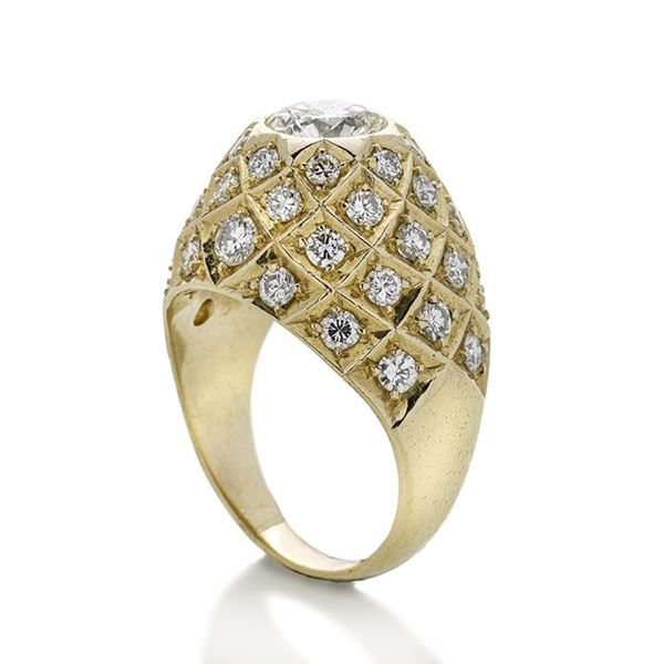 MATERIALE: oro giallo e diamanti DESCRIZIONE: particolare anello con diamante taglio brillante su alta base interamente impreziosita con diamanti taglio brillante entro motivo a rete, reca il marchio 750 MISURE: anello 12 PESO: diamante centrale ct 1.20, colore H-I, purezza Vs e diamanti laterali ct 0.90, colore H, purezza VS, gr 10.1