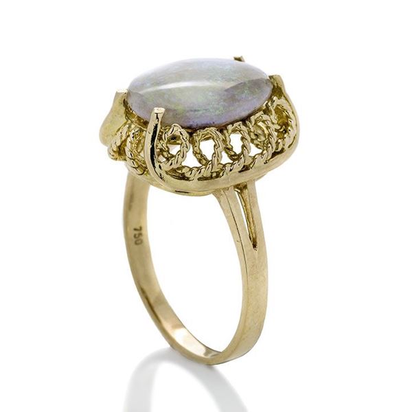 MATERIALE: oro giallo e opale bianco arlecchino DESCRIZIONE: anello realizzato con opale bianco arlecchino taglio cabochon su alta base impreziosita da motivo a cordonetto disposto ad imitazione del nastro, reca il marchio 750 MISURE: anello 16 PESO: gr 6.3