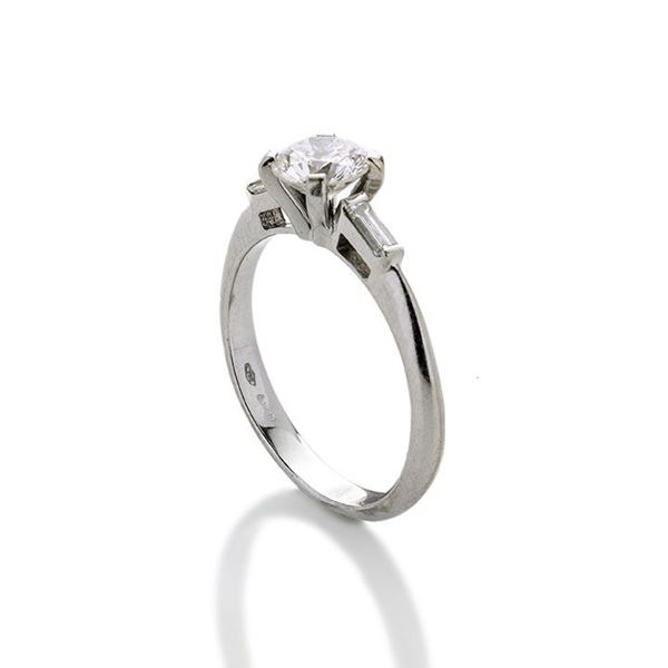 MATERIALE: oro biacno e diamanti DESCRIZIONE: anello soliatrio realizzato con diamante taglio brillante impreziosito da un diamanti taglio baguette su ogni lato, reca il marchio 750 MISURE: anello 17.5 PESO: diamante centrale ct 1.0, colore H, purezza SI1, gr 3.8