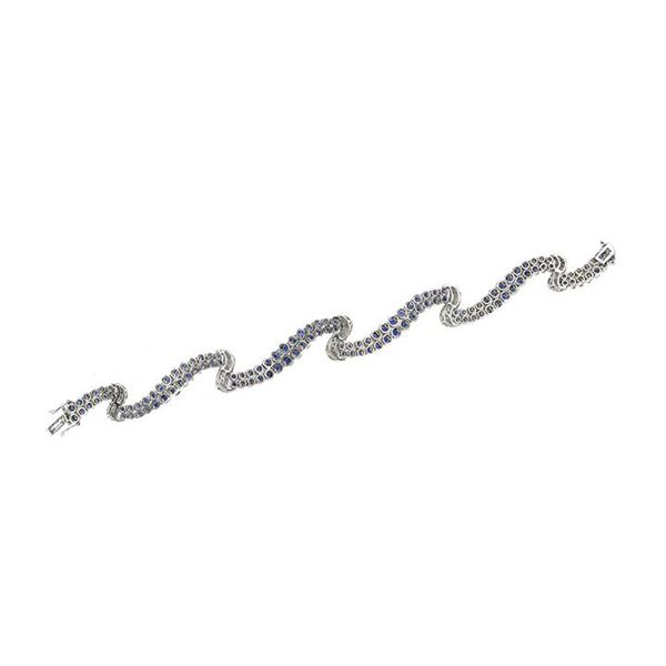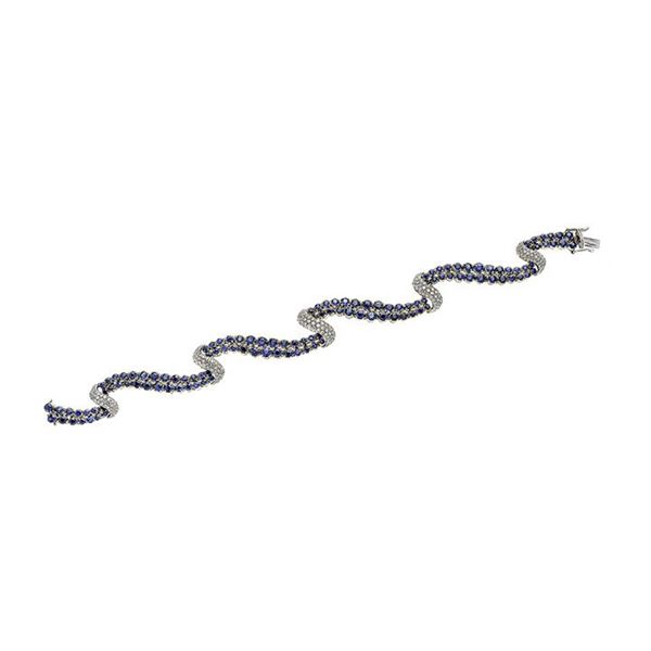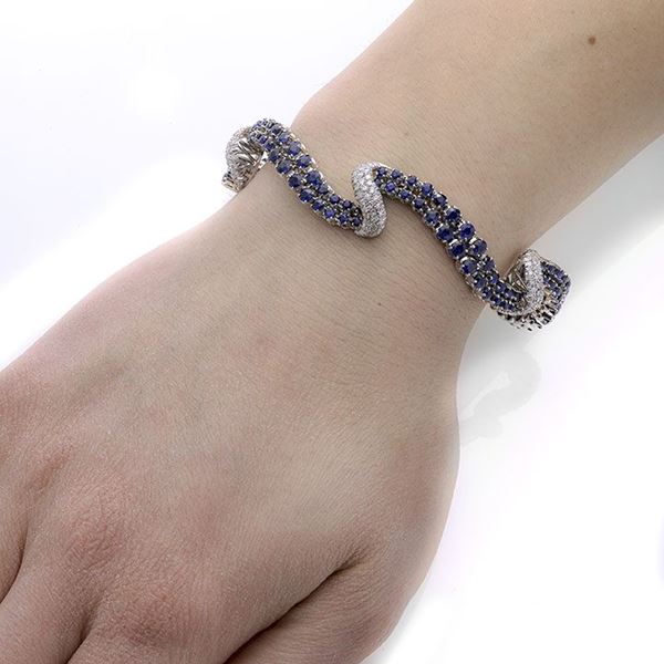MATERIALE: oro bianco diamanti e zaffri DESCRIZIONE: bracciale realizzato ad imitazione del nastro, interamente impreziosito con zaffiri leggermente degradè disposti su due file parallele, alternati a maglie con pavè di brillanti, reca il marchio 18kt MISURE: bracciale aperto 19.1 PESO: gr 31.9