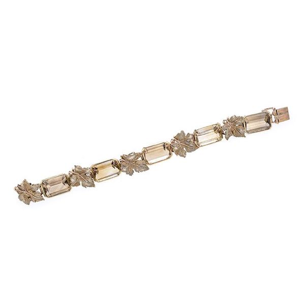MATERIALE: oro giallo e quarzi citrini DESCRIZIONE: bracciale realizzato con foglie di vite realisticamente modellate in oro giallo inciso alternate a grandi quarzi citrini di taglio rettangolare MISURE: bracciale aperto cm 19.8 PESO: gr 52.2