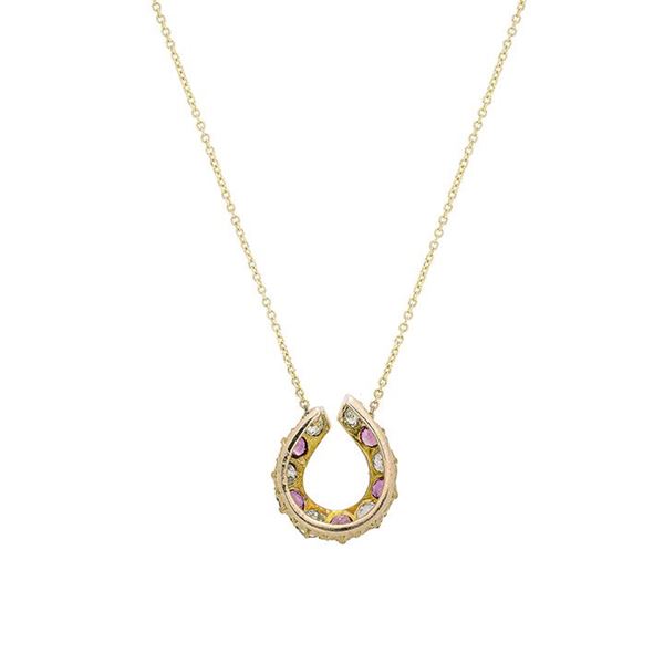 MATERIALE: oro giallo, oro a basso titolo, rubini e diamanti DESCRIZIONE: collana a maglie intrecciate con pendente realizzato come un ferro di cavallo impreziosito da diamanti taglio vecchio alternati a rubini MISURE: collana aperta cm 44.5 PESO: gr 1.9