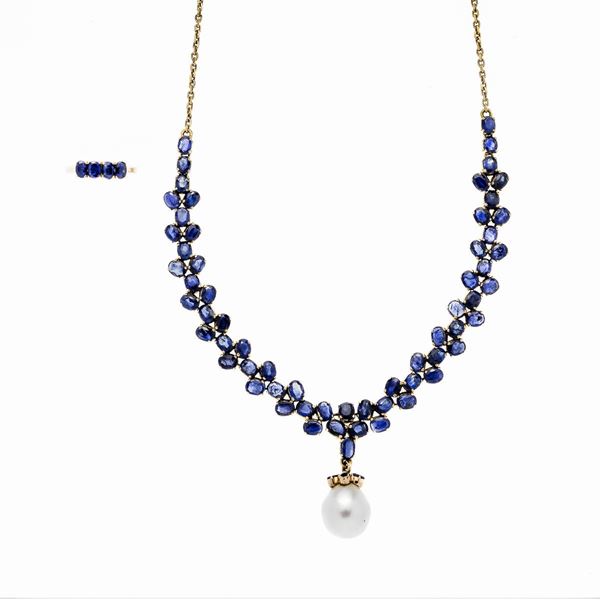 MATERIALE: oro giallo, zaffiri e perla DESCRIZIONE: collier realizzato con catena a maglie intrecciate e nella parte frontale tralcio interamente impreziosito da zaffiri taglio ovale con perla pendente ed un anello en suite MISURE: collier aperto cm 45.5, anello 5 PESO: collier zaffiri ct 31, perla diamtero mm 12, gr 31.5 complessivi