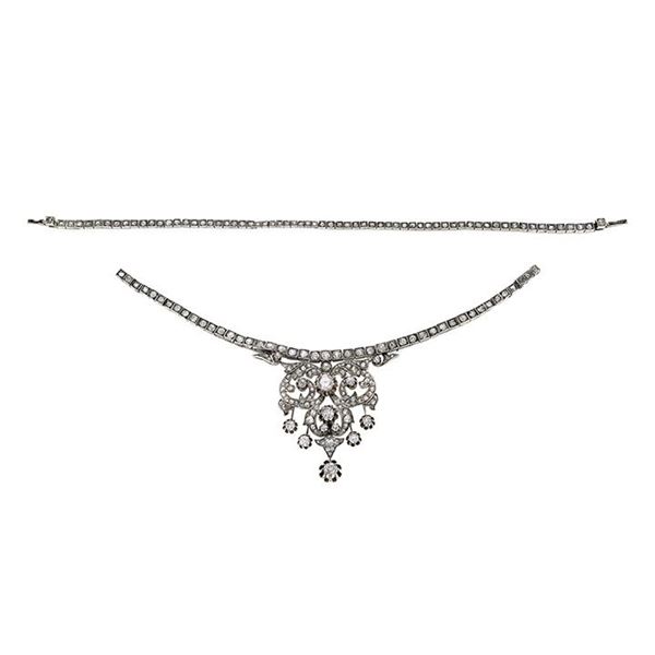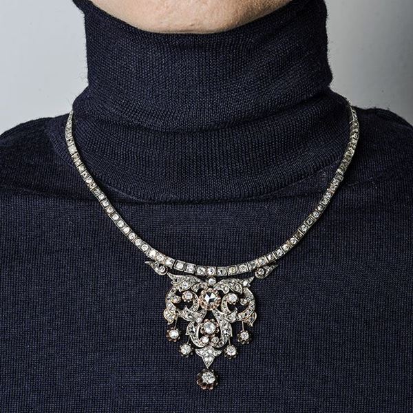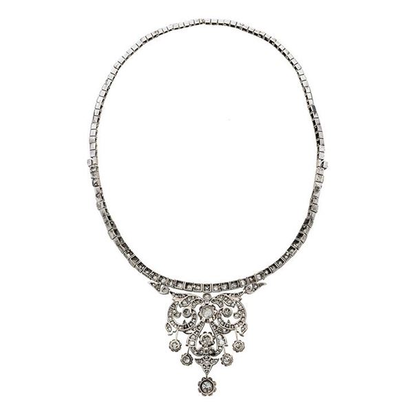 MATERIALE: oro a basso titolo, argento e diamanti DESCRIZIONE: collier realizzato con maglie quadrate ciascuna impreziosita con diamanti taglio vecchio, con grande pendente nella parte centrale, di ispirazione floreale, interamente impreziosito con diamanti taglio vecchio e rose coronè MISURE: aperto cm 39.5 PESO: diamanti ct 11.40, colore I-J, purezza P1, gr 45.8