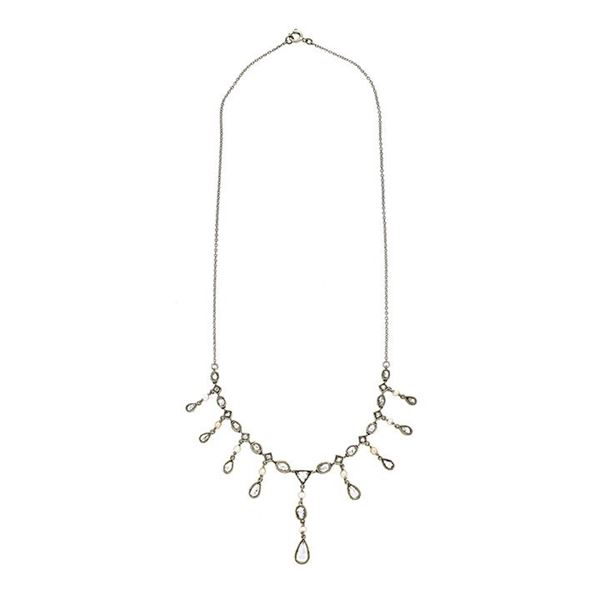 MATERIALE: oro a basso titolo, argento, platino, perle e diamanti DESCRIZIONE: particolare collier realizzato con maglie intrecciate tra loro e nella parte frontale, una serie di rose di diamanti in castoni ovali e romboidali, con perle e gocce pendenti, ciascuna con un diamante taglio goccia coronè, nel centro un diamante taglio tringolare che sorregge un pendente formato da due perle un diamante taglio ovale ed uno finale taglio goccia MISURE: aperto cm 41.5 PESO: gr 7.8