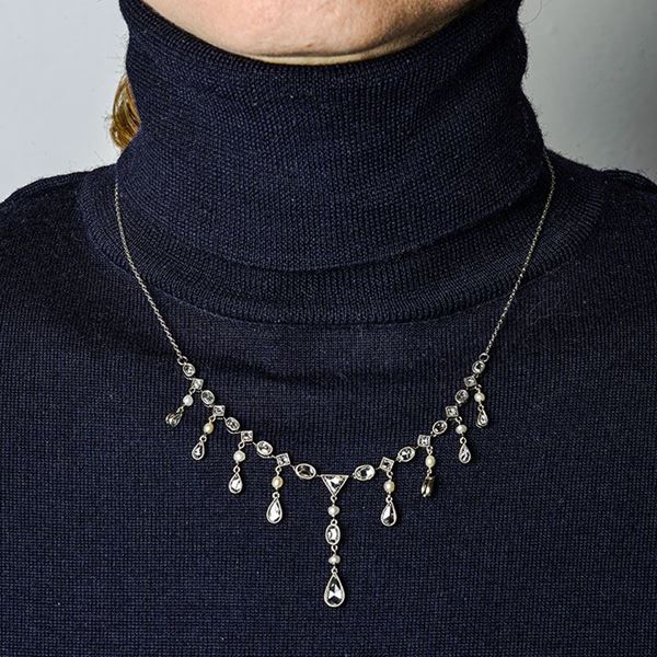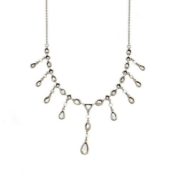 Collier in oro a basso titolo, argento, platino, perle e diamanti