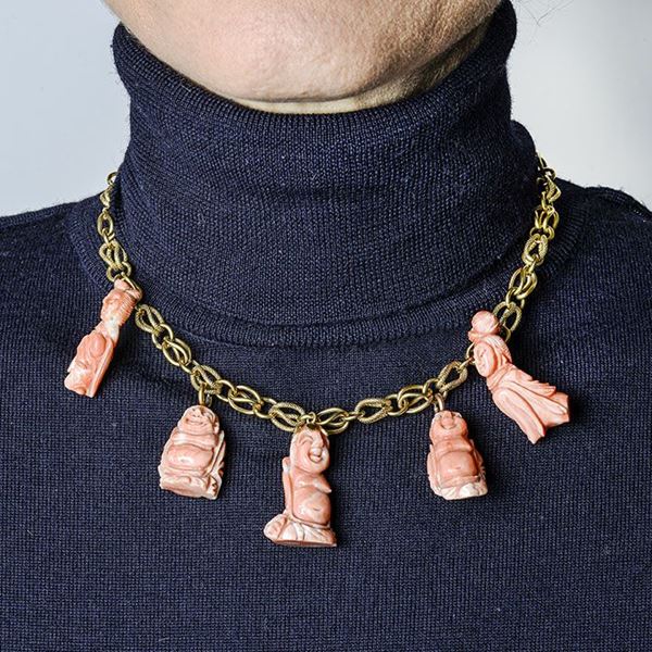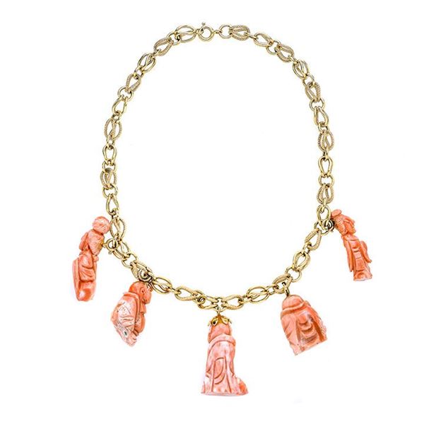 MATERIALE: oro giallo e corallo rosa DESCRIZIONE: girocollo realizzato a maglie intrecciate incise e lisce alternate e impresiozito nella parte centrale da cinque charms tre dei quali scolpiti come un Buddha e due come gheishe, reca marchio 750 MISURE: collana aperta cm 39 PESO: 55 gr