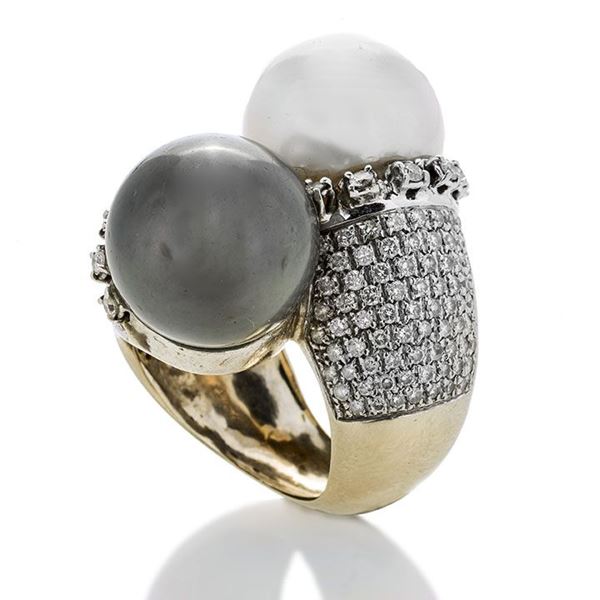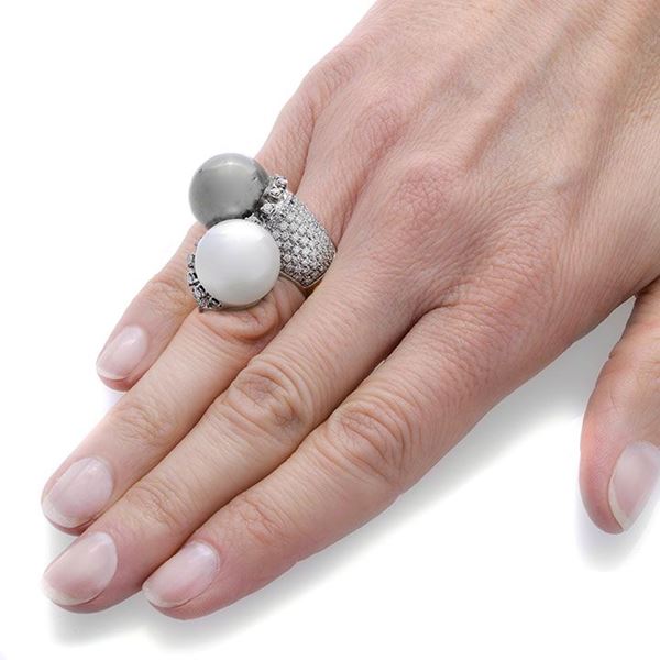 MATERIALE: oro bianco, diamanti, perla e perla tahiti DESCRIZIONE: grande anello contrariè in oro bianco, realizzato con due perle, di cui una tahiti, impreziosito su ciascun lato da diamanti taglio brillante e pavè di diamanti MISURE: anello 12 PESO: perla tahiti diametro mm 13, perla diametro mm 14, gr 33.6