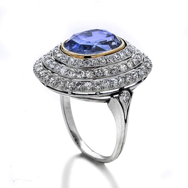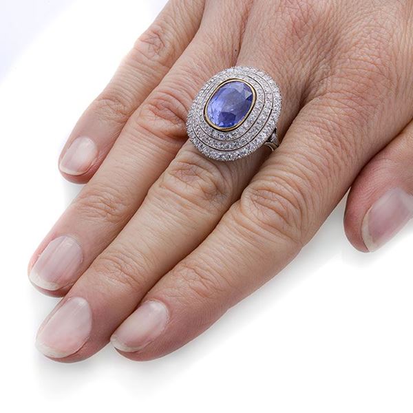 MATERIALE: oro bianco, oro giallo, diamanti e zaffiro DESCRIZIONE: grande anello realizzato con zaffiro taglio ovale incorniciato da tre fasce di diamanti taglio brillante disposte a scalare MISURE: anello 16 PESO: gr 10.3