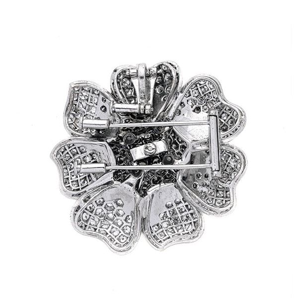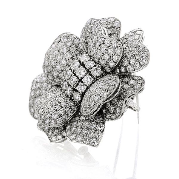 MATERIALE: oro bianco e diamanti DESCRIZIONE: grande clip realizzata come un fiore interamente impreziosita con diamanti taglio brillante, reca il marchio 750 MISURE: cm 4.5x 4.5h PESO: diamanti ct 10, colore G, purezza VS, gr 40.6