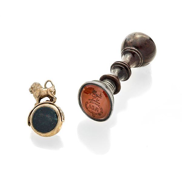Grande sigillo in legno, argento e corniola ed un altro in oro a basso titolo e pietra dura