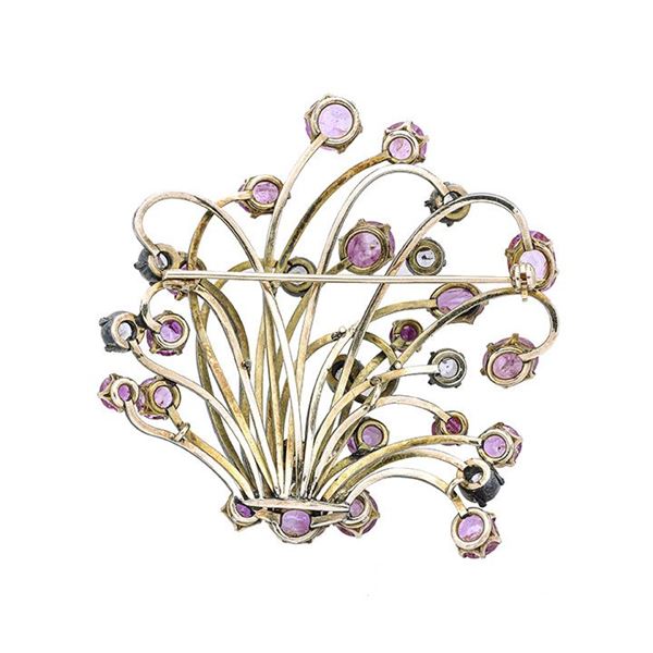 MATERIALE: oro a basso titolo, argento, diamanti e rubini DESCRIZIONE: grande spilla realizzata come un mazzo di fiori stilizzato, impreziosita nelle parti finali con rose di diamanti e rubini taglio rotondo e ovale MISURE: cm 5.7x 5.7h PESO: gr 28.8