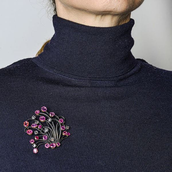 Grande spilla in oro a basso titolo, argento, diamanti e rubini