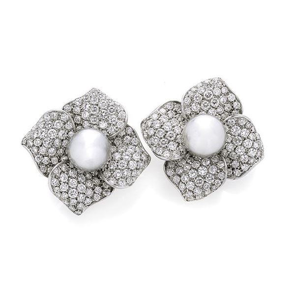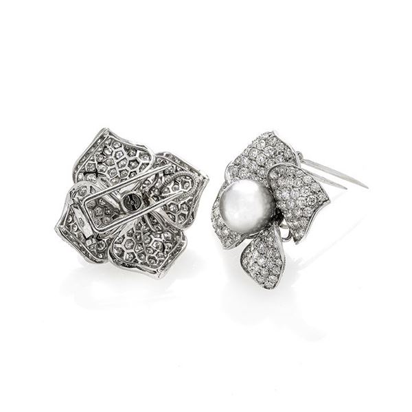 Paio di clips in oro bianco, diamanti e perle Tahiti