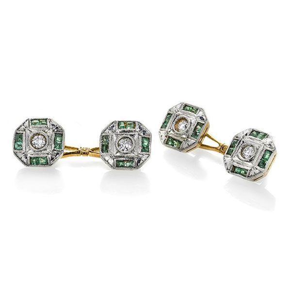 Paio di gemelli da donna in oro giallo, platino, diamanti e smeraldi