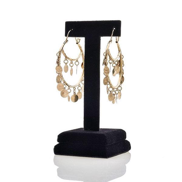 MATERIALE: oro giallo DESCRIZIONE: paio di grandi orecchini a cerchio di ispirazione gipsy impreziositi con charms in oro a basso titolo MISURE: diametro interno cm 4.2 PESO: gr 14.8
