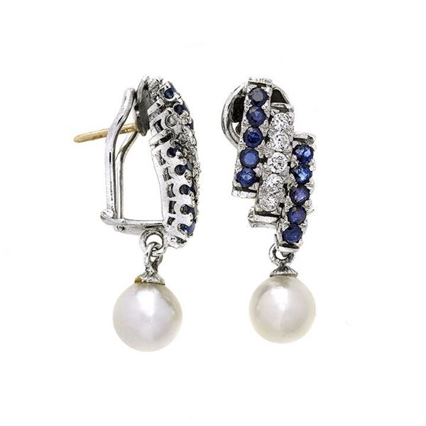 Paio di orecchini a clips in oro bianco, diamanti, zaffiri e perle coltivate
