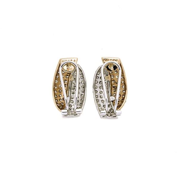 MATERIALE: oro giallo, oro bianco e diamanti DESCRZIONE: paio di orecchini a clips di ispirazione geometrica ciascuno interamente impreziosito da pavè di diamanti, recano i marchi 18k e 120 MISURE: cm 0.9x2.1h PESO: gr 7.2
