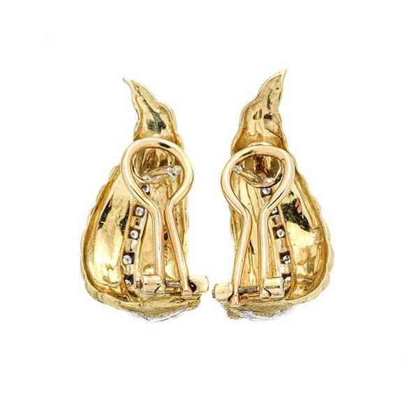 MATERIALE: oro giallo, oro bianco e diamanti DESCRIZIONE: paio di orecchini a clips ciascuno realizzato come una foglia lanceolata in oro giallo inciso e impreziosito da piccoli diamanti MISURE: cm 1.3x2.7 h PESO: gr 10.2