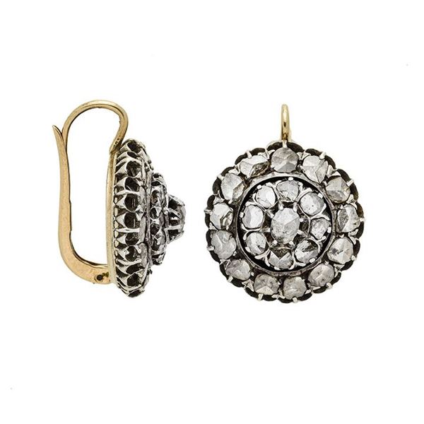 MATERIALE: oro a basso titolo, argento e diamanti DESCRIZIONE: paio di orecchini a monachella, ciascuno realizzato di forma circolare interamente impreziosito con rose di diamante MISURE: cm 1.5x 2h PESO: gr 9.1