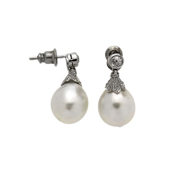 MATERIALE: oro bianco, diamanti e perle DESCRIZIONE: paio di orecchini ciascuno realizzato con un diamante taglio vecchio impreziosito con perla scaramazza pendente, reca il marchio 18 kt MISURE: cm 1.1x2.2 PESO: perla mm 9, gr 7.4