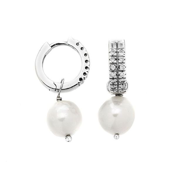 MATERIALE: oro bianco, diamanti e perle DESCRIZIONE: paio di orecchini a cerchio ciascuno impreziosito nella parte frontale da due fasce con piccoli brillanti e perla pendente, recano il marchio 750 MISURE: cm 0.4x2.6h, perla mm 8 PESO: gr 8.9