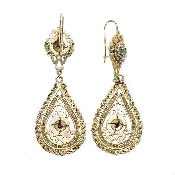 Paio di orecchini pendenti in oro giallo, smeraldi, rubini e microperle