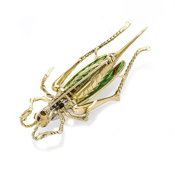 Spilla cavalletta in oro giallo, smalti colorati e diamanti