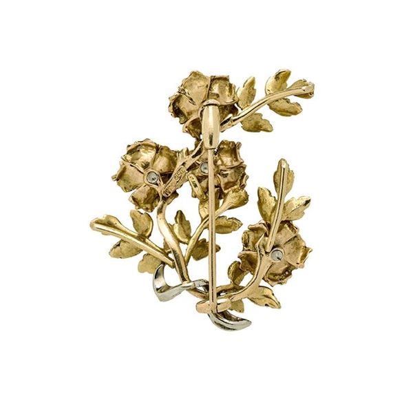 MATERIALE: oro giallo e zaffiri DESCRIZIONE: spilla di ispirazione floreale, realisticamente modellata come un tralcio di rose impreziosito con zaffiri taglio cabochon, reca il marchio 750 MISURE: cm 3.1x 3.8h PESO: gr 14.2