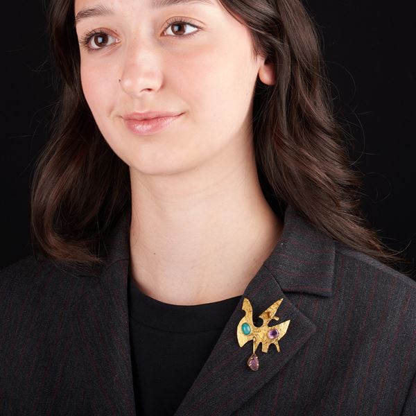 MATERIALE: oro giallo e pietre semipreziose DESCRIZIONE: spilla realizzata come una fenice stilizzata in oro giallo e pietre semipreziose di vari colori e tagli, firmata "FORLIVESI", reca il marchio 750 MISURE: cm 3.9x 6.4h PESO: gr 13