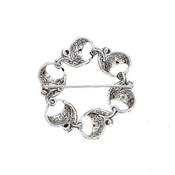MATERIALE: platino e diamanti DESCRIZIONE: spilla di ispirazione floreale, realizzata come un serto di foglie stilizzate interamente impreziosite con diamanti taglio brillante e taglio huit huit , alterante a piccoli diamanti sempre taglio brillante MISURE: cm 4.3x 4.5h PESO: diamanti ct 1.70, colore G-H, purezza VS, gr 12.7