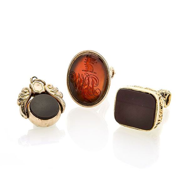 Tre sigilli in oro a basso titolo, corniola incisa e pietra dura