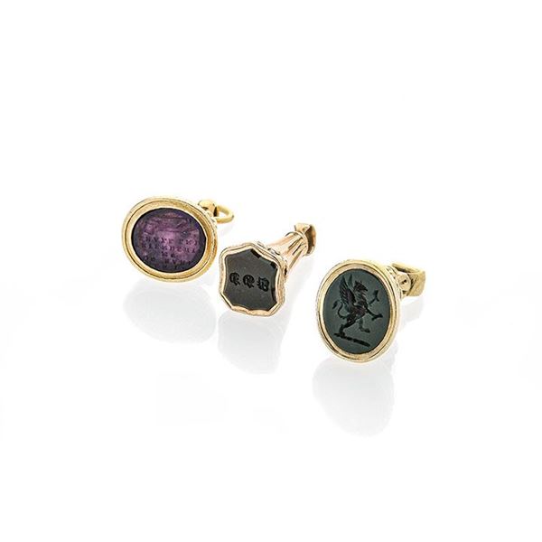 Tre sigilli in oro a basso titolo e pietre dure incise