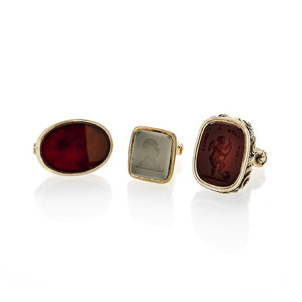 Tre sigilli in oro a basso titolo, pietra dura e corniola