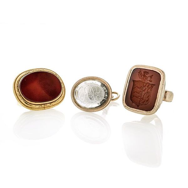 Tre sigilli in oro a basso titolo, quarzo e corniola