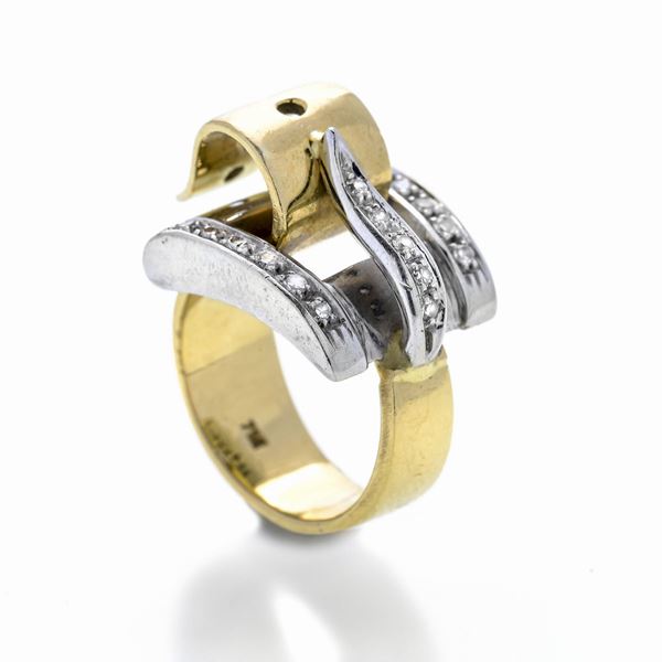MATERIALE: oro giallo, oro bianco e diamanti DESCRIZIONE: anello da mignolo realizzato come una cintura con grande fibbia in oro bianco impreziosita con diamanti taglio brillante, reca inciso il numero 23 e reca il marchio 750 MISURE: anello 5 PESO: diamanti ct 0.17, gr 10.6