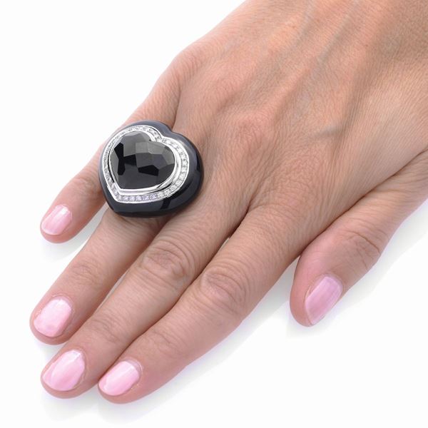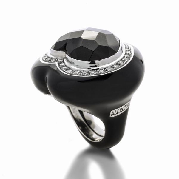 MATERIALE: oro bianco, smalto nero, onice e diamanti DESCRIZIONE: grande anello a cuore realizzato con al centro onice sfaccetato incornicato con diamanti taglio brillante su alta base in smalto nero che continua sulla fascia, firmato ALLEGRA, reca i marchi 925 e 750 MISURE: anello 14 PESO: gr 37