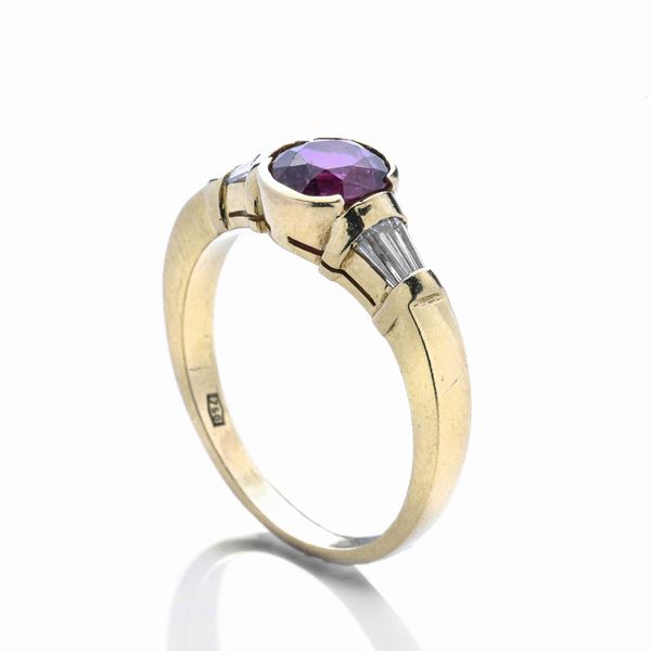 MATERIALE: oro giallo, diamanti e rubino DESCRIZIONE: anello realizzato con rubino taglio rotondo impreziosito da tre diamanti taglio trapezio su ciascun lato, reca il marchio 750 MISURE: anello 18 PESO: rubino ct 1.20, diamanti ct 0.40, gr 5.4