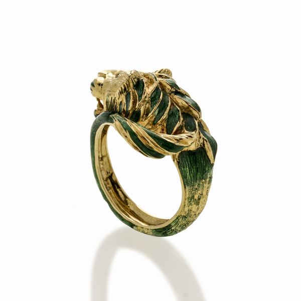 MATERIALE: oro giallo e smalti nei toni del verde e del marrone DESCRIZIONE: anello realisticamente modellato come una testa di leone, occhi in smalto marrone, corpo ad imitazione del manto nei toni del verde, reca il marchio 750, lievi cadute allo smalto MISURE: anello 10 PESO. gr 13.7