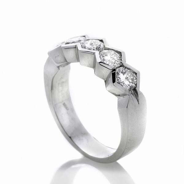 MATERIALE: oro bianco e diamanti DESCRIZIONE: anello riviere realizzato con cinque diamanti taglio brillante disposti in castoni esagonali, reca il marchio 750 MISURE: anello 18 PESO: diamanti ct 1.75 , colore H, purezza VS, gr 8.3