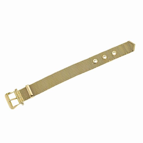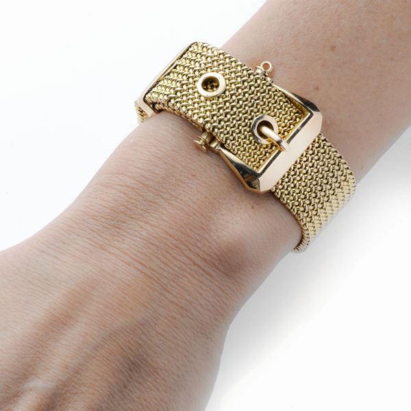MATERIALE: oro giallo DESCRIZIONE: bracciale realizzato come una cintura con grande fibbia liscia leggermente bombata e maglie intrecciate ad imitazione del tessuto, reca il marchio 750 MISURE: aperto cm 25.5 PESO: gr 78.2