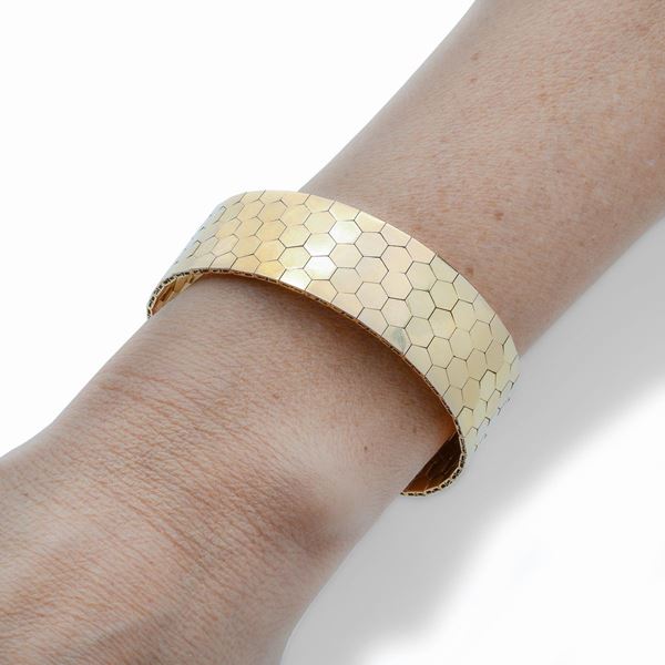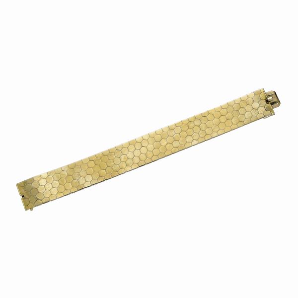 MATERIALE: oro giallo DESCRIZIONE: bracciale realizzato ad imitazione del tessuto con maglie a nido d'ape, reca il marchio 750 MISURE: aperto cm 19 PESO: gr 53.0